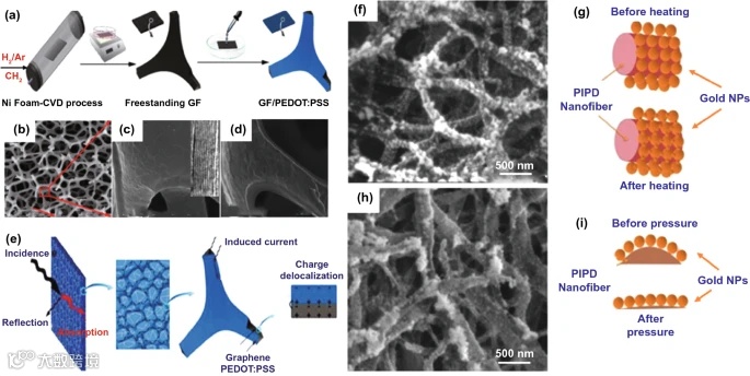图9. (a) GF/PEDOT:PSS复合材料的制备流程; 涂覆PEDOT:PSS涂层前(b,c)后(d)的GFs的SEM和TEM图; (e) EMI屏蔽机理示意图; (f-i) PIPD-g-PDDA/Au₆复合材料的SEM图; PIPD-gPDDA/Au₆复合材料在3 MPa压力下压制2 h的SEM图; 金网在压制过程中的变化。
