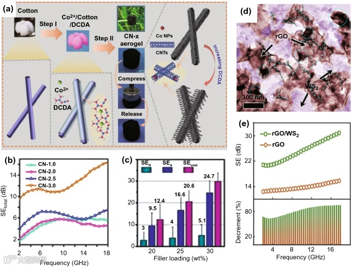 图5. (a) CN-x复合材料制备图;(b) 复合材料的SET;(c) CN-3.0复合材料的SER、SEA、SET;(d) WS2-rGO结构的TEM图;(e)WS2-rGO和rGO的SE。