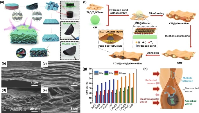 图2.(a) MXene泡沫的制备示意图;(b-e) MXene泡沫的SEM图;(f) 具有“蛋盒”结构的CCM @空隙@ MXene(CVMF)薄膜的制备示意图;(g) EMI屏蔽性能对比;(h) EMWs通过CVMF传播的示意图。