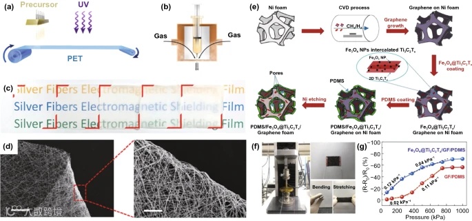 图11. (a) AgNF的制备示意图; (b) 吹塑纺丝原理; (c) 纤维膜照片; (d) 弯曲AgNF膜及其部分放大区域的SEM图; (e) Fe₃O₄@Ti₃C₂TX/GF/PDMS复合材料制备示意图; (f) 用于压力传感测量的设备图片(左图)、石墨烯基复合材料(右图); (g) GF/PDMS和Fe₃O ₄@Ti₃C ₂TX/GF/PDMS复合材料的相对电阻随施加压力的变化曲线。