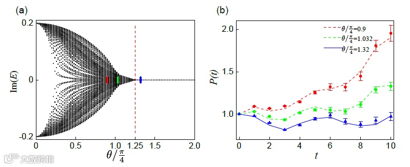 薛鹏团队及合作者通过时间域光量子实验平台, 实验上模拟了非厄米且具有PT对称的Aubry-André-Harper (AAH)模型, 通过添加依赖于位置和偏振的无序相位来实现准周期势场, 并在此基础上通过设计动力学可观测量例如李雅普诺夫指数(图.2), 动力学逆参与比(dIPR)(图.3),时间演化的光子总几率(图.4), 在实验上观测到多重相变的过程。