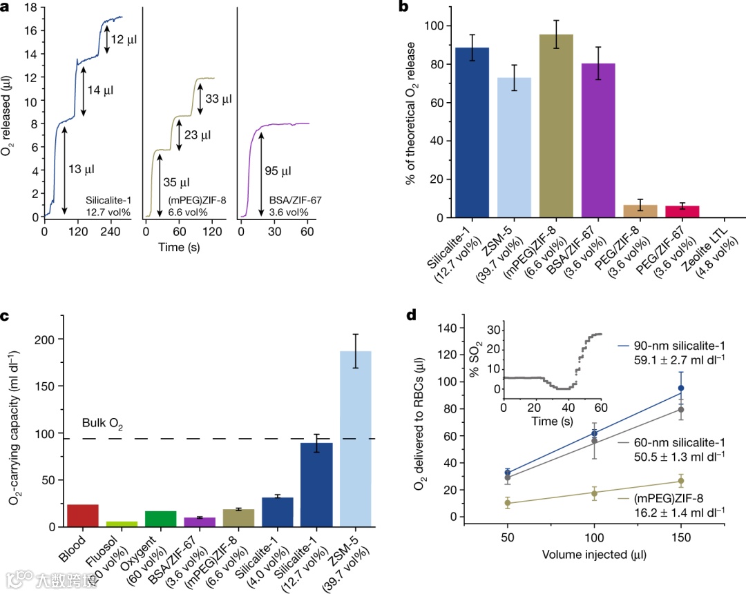 在数亿年的时间里,大自然进化出了复杂而严格控制的系统来运输水中的氧气,而当这些系统缺失或失效时,要输送足够的O2来防止缺氧是一项挑战。微孔液体提供了一种途径,使O2的可逆容量远远超过之前的研究值,允许更小体积的水溶液输送更多的氧气。silicalite-1和ZIF-8纳米晶体分别吸附了731 ml·dl-1和241 ml·dl-1的O2,在固体状态下,低浓度的水溶液能够存储和输送密度特别高的O2(图4c)。此外,调节胶体溶液中纳米晶体浓度,可以获得更高的载氧值(图4b)。同时,还有一些纳米晶体,例如沸石ZSM-5等,也可以形成微孔溶液,拥有极高的携氧能力。