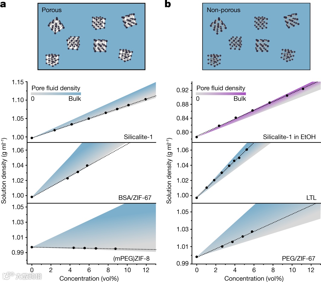 在给定温度下,将几种微孔纳米晶体胶体溶液的测量密度(黑色圆圈)绘制为纳米晶体浓度的函数。作为纳米晶体浓度函数的理论密度用阴影表示,灰色对应于具有完全干燥的孔的溶液,蓝色或紫色对应于孔填充有水性溶剂或乙醇(EtOH)的溶液,分别与密度相同本体溶剂。图2a中,silialite-1、BSA/ZIF-67和(mPEG)ZIF-8纳米晶体在水中的胶体溶液密度与含有干孔的微孔流体一致,表明这几种纳米晶体的微孔在液态水中是干燥的。这与silialite-1在乙醇(EtOH)中的胶体溶液形成对比,极性较小的EtOH分子在环境压力下受到热力学的影响。而亲水性沸石LTL的胶体溶液中,水侵入到极性更大的硅铝酸盐孔隙中,在环境条件下也受到热力学上青睐。它们的密度都与含有溶剂填充微孔的无孔液体一致(图2b)。