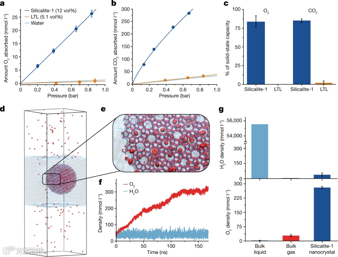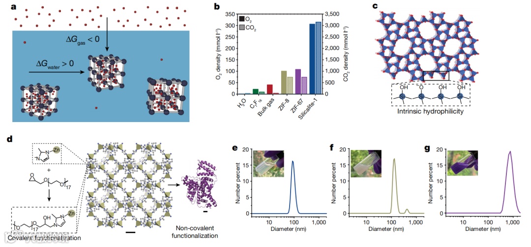 利用具有疏水内表面和亲水外表面的微孔纳米晶体在水中形成稳定、均匀的胶体溶液,其中含有能够吸附气体分子的永久干燥孔隙(图1a示意图)。采用两种不同疏水性沸石(ZIF和Silicalite)制备胶液,并比较其性质与气体吸附能力,Silicalite-1以超230倍的O2和90倍的CO2的固态吸附成为有利候选(图1b,c和e为对应晶体结构)。为了在水中创建均匀、稳定的silicalite-1胶体溶液,并评估其永久微孔隙度,优化了合成、纯化和煅烧条件,以形成类似大小的纳米晶体(图1e)。图1f和g为、ZIF-8 (f)和 BSA/ZIF-67胶体粒度分布,插图分别显示了纳米晶体浓度为 12 vol%、4 vol% 和 3 vol%的溶液照片。