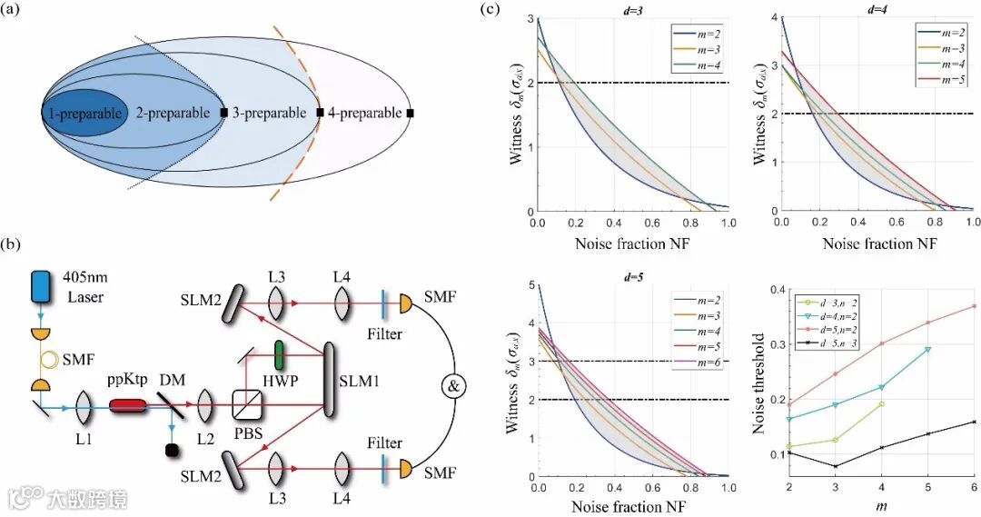 图1:(a) 真正高维导引结构;(b) 双光子高维导引实验;(c) 理论结果