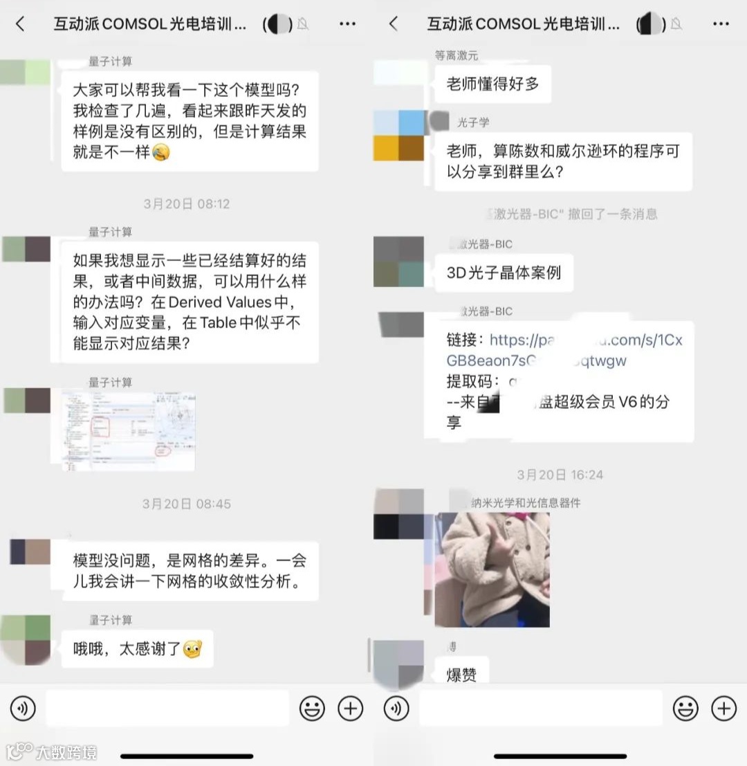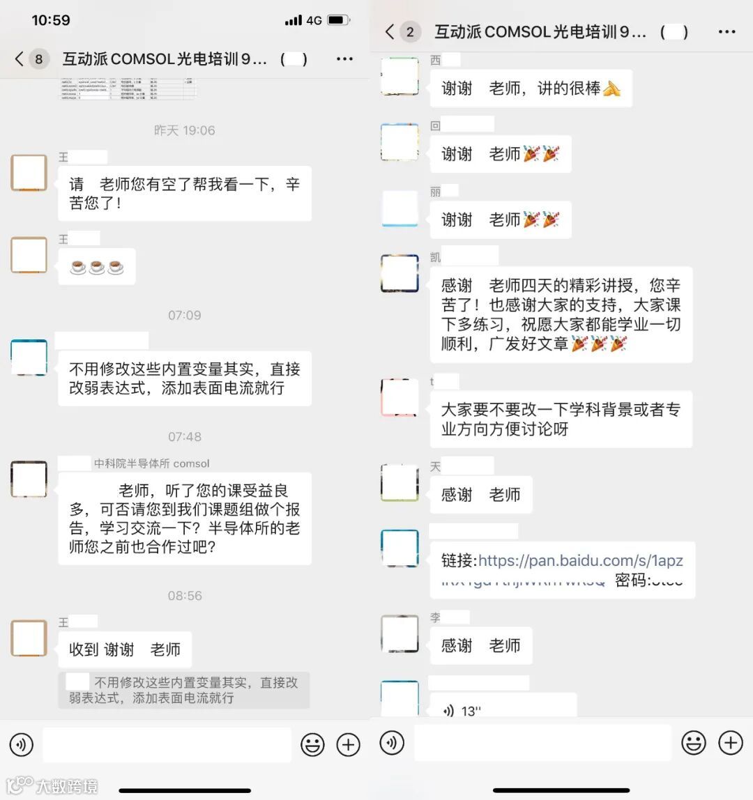 1.本次课程共4天,采用“2+2”教学体系,分两阶段授课,给与学员巩固练习时间;采用线上实训、Step by step的教学方式、课堂上连麦答疑、课后提供无限次回放视频,发送全部案例模型文件,建立永不解散的课程群,长期互动答疑;以具体案例和科研论文为实例,讨论在处理具体问题时如何应用COMSOL以及如何做出能够发表的结果;