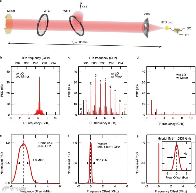 太赫兹频率范围内的光学频率梳是人们期待已久的分子光谱学和高速无线通信的频率标准。然而,此类光源通常依赖于耗能和昂贵的飞秒激光器。基于半导体器件的高效、廉价的太赫兹频率梳形源的开发仍在进行中。量子级联激光器(QCL)是一种基于半导体的太赫兹频率梳状源的有希望的候选者,它是一种发射瓦特级太赫兹波的紧凑型器件。此外,中红外QCL梳中的差分频率生成已被用于在室温下制作1.8至3.3 THz的频率梳。然而,QCL很难产生低于1.8 THz的太赫兹梳。也有基于硅CMOS技术的器件。例如,基于乘法器的频率梳源被证明可用于220至330 GHz范围内的光谱学,以及使用双极CMOS器件生成0.03至1.1 THz的频率梳。然而,CMOS器件很难产生更高频率的太赫兹波。