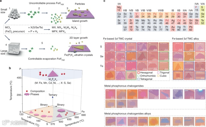 二维(2D)材料包括单晶、二元和三元晶体等不同体系,由于其在量子器件和信息技术方面具有潜在的应用前景,因此被受到广泛关注。为研究其潜在的物理特性并实现其潜在的应用,研究学者致力于合成超薄的2D材料。到目前为止,已经利用不同的制备方法制备了多种不同类型的2D材料。近年来,近年来,虽然合成二元过渡金属硫族化合物(TMCs)的工作很少,但具有不同相/组成的二元硫族化合物的可控合成并不简单,特别是二维过渡金属磷硫族化合物(TMPCs)晶体的制备更具有挑战性。到目前为止,还没有一种通用的方法来合成这些二维多相/复合材料。这是因为它们具有可变的价态以及多态的特征,例如MX(六边形和四边形)、MX2(六边形和四边形)、M2X3、M3X4、M5X8、MPX、MPX3等。这些都使得制备单相TMPCs和TMCs的化学反应变得不可控。值得注意的是,这些TMPCs和TMCs具有丰富的原子结构和奇特的物理性质,例如,MPX3、FexGeTe2和FeSexTe1-x是研究二维反铁磁性、铁磁性和拓扑超导的理想材料。另外,TMPCs为研究多体激子和自旋电子器件提供了极好的研究平台。因此,单组分或单相晶体的可控合成具有重大意义。