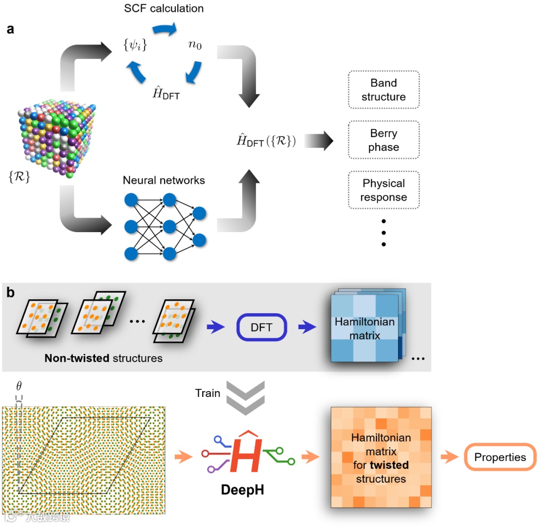 DeepH方法用于高效电子结构计算的示意图。ab, 使用DeepH方法研究转角范德瓦尔斯材料的流程图。通过无转角材料构型的密度泛函理论结果训练,DeepH模型可以高效准确地预测各种转角材料构型的物理性质。