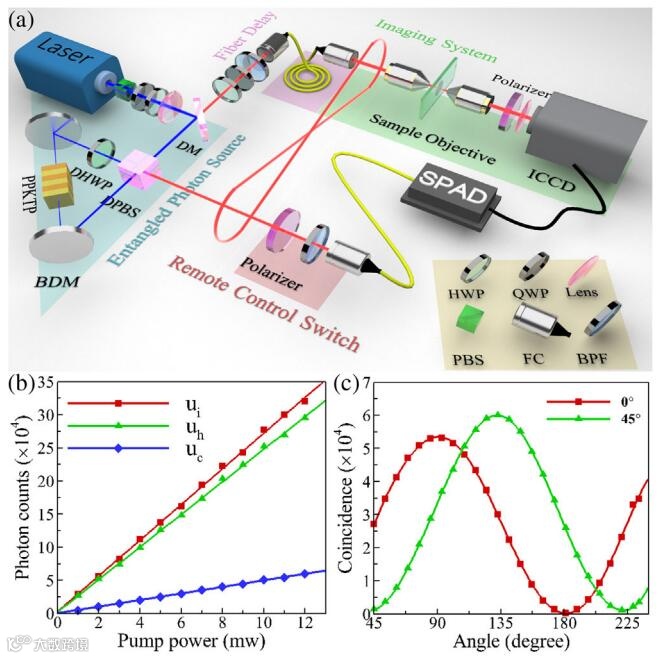 图1 (a)量子暗场显微成像实验装置图。(b)不同泵浦功率下信号端(红线)、预示端(绿线)和两者之间的符合(蓝线)光子计数。(c)符合光子计数和偏振角之间的关系。
