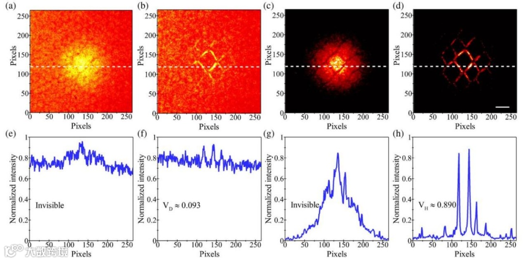 图2 透明生物细胞的量子显微成像结果。(a)和(b)内部触发ICCD的直接明场像和直接暗场像。(c)和(d)由单光子触发的量子明场像和暗场像。(e)-(h)分别沿(a)-(d)中的白色虚线提取的强度分布。