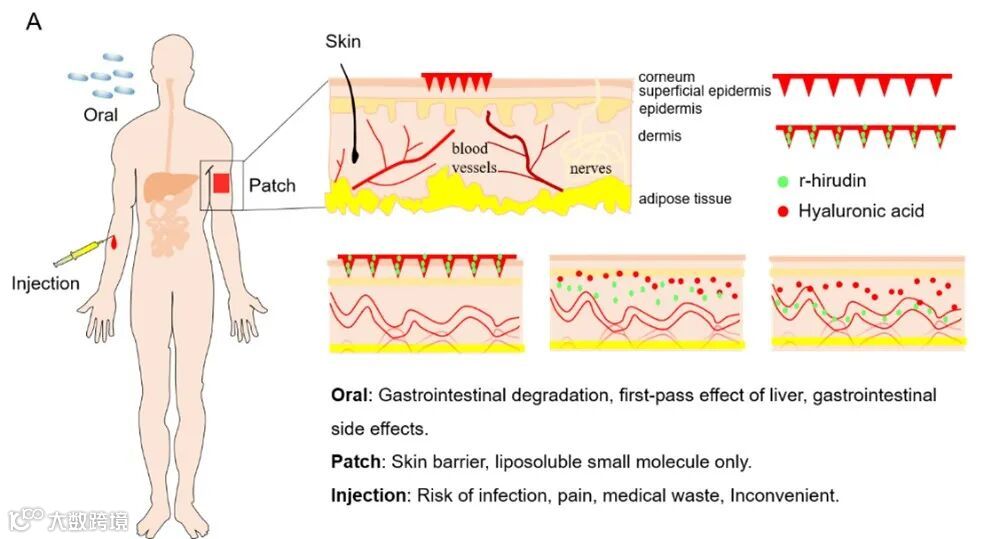 抗凝治疗通常被用作心脑血管疾病治疗的首选策略,且此类患者大多需要长期甚至终身服用抗凝药物。直接口服抗凝剂有导致胃肠道出血的风险,尤其是对于有胃肠道疾病如胃肠道溃疡的患者,这种出血是致命的。皮下或静脉注射给药或可规避胃肠道出血的风险,但是注射给药需专业人员辅助,这对长期用药的患者而言极其不便,注射引起的疼痛亦会导致患者用药依从性较差。此外,皮下注射抗凝剂还会导致皮下出血淤青,增加感染风险,给抗凝药物临床应用带来了极大的不便。透皮给药作为一种前瞻性给药策略,可以补充注射和口服给药的局限性 (图1)。