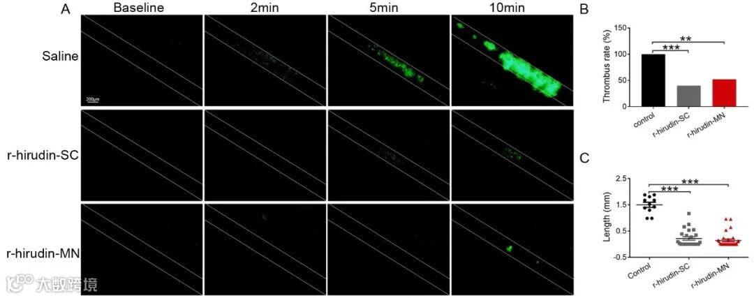 图 6. 3DMN 在预防肠系膜微动脉血栓中的应用 A. 血小板在血管损伤部位聚集的体内成像;B. 血栓形成率的统计分析图;C. 血栓形成长度统计分析图