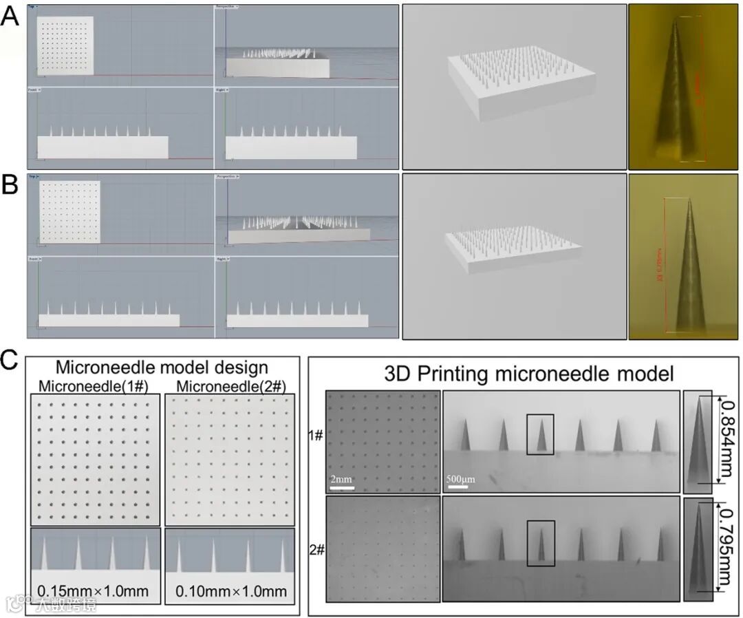 图2.微针阵列模型的设计与打印 A. 1#微针阵列模型的计算机模拟(左)、打印预览(中)及3D 打印微针的长度(右);B.2#微针阵列模型的计算机模拟(左)、打印预览(中)及3D 打印微针的长度(右);C.设计模型和打印模型对比