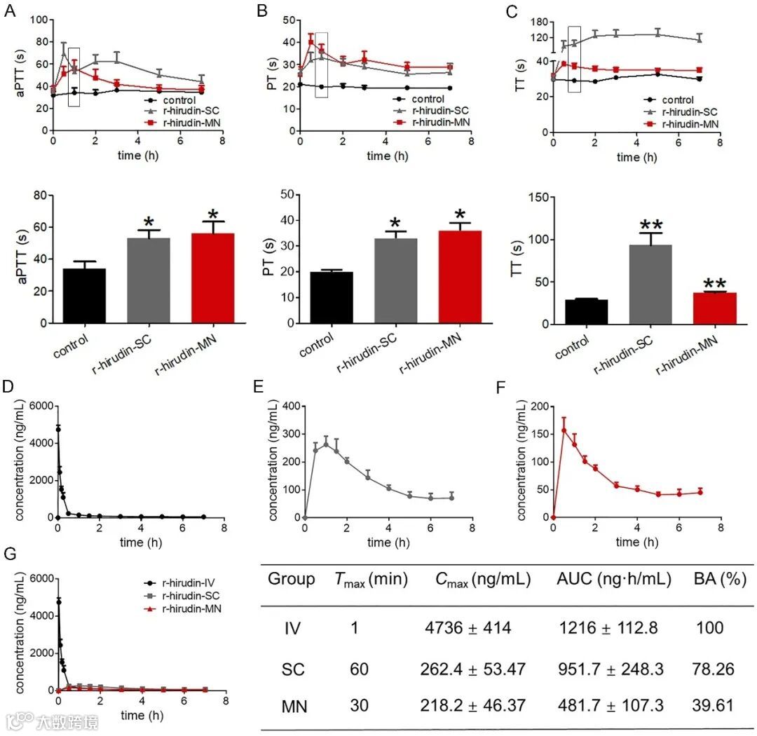 图4. 3DMN 介导的r-hirudin 透皮递送的体内药效学与药物代谢动力学研究 A-C. 血液凝固时间随给药时间的变化;D-F. 血清 r-hirudin 浓度随时间变化曲线;F. 不同给药方式血清药物浓度随时间变化曲线 G. 不同给药方式血清药物浓度参数