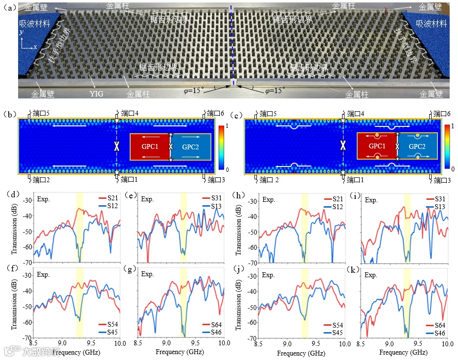 图2 紧凑型双边四通道拓扑分束。(a)实验样品。蓝色虚线表示两块反手性磁光光子晶体的边界。(b,c)仿真计算结果:(b)无金属障碍物;(c)存在金属障碍物。(d‑k)实验测量结果:(d‑g)无金属障碍物,(h‑k)存在金属障碍物。
