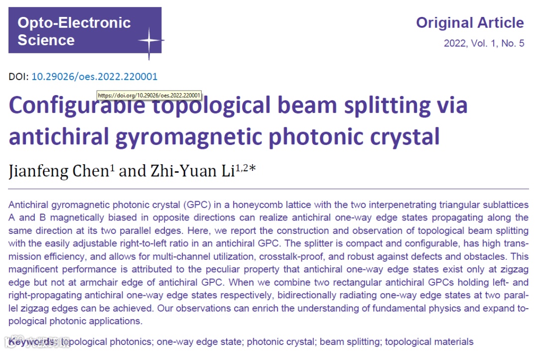 Jianfeng Chen and Zhi-Yuan Li*, Configurable topological beam splitting via antichiral gyromagnetic photonic crystal, Opto-Electronic Science 1(5): 220001 (2022).
