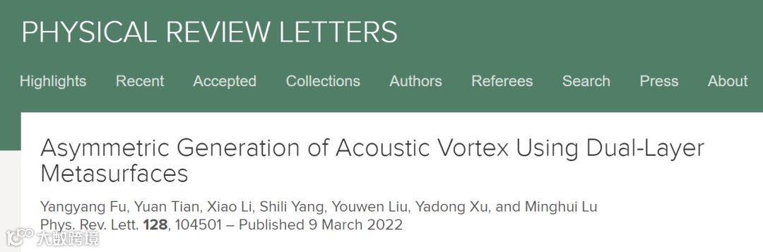 近日,南京航空航天大学的伏洋洋副研究员、苏州大学的徐亚东教授和南京大学的卢明辉教授等合作,利用双层超构表面中的单向轨道角动量转化机制,首次提出涡旋声场非对称产生的新现象和物理机制。相关成果以 “Asymmetric generation of acoustic vortex using dual-layer metasurfaces”为题发表在知名物理学期刊《Physical Review Letters》上(Phys.Rev.Lett.128.104501(2022))。伏洋洋副研究员、徐亚东教授和卢明辉教授为该工作的共同通讯作者;伏洋洋副研究员、南京大学博士生田源和南京航空航天大学研究生李潇为共同第一作者;南京大学研究生杨世礼和南京航空航天大学刘友文教授亦对该工作有重要贡献。