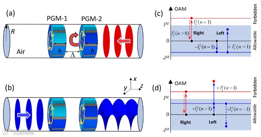 非对称传输现象因其在实现单向器件上起着重要作用而受到研究人员广泛的关注。近年来,为实现光/声的非对称效应,研究人员探索了许多方案,例如磁光材料、非线性、非厄米、拓扑绝缘体以及超构表面等,并揭示了诸如单向模式转化、非对称衍射和单向等离激元激发等众多新奇现象。然而,这些方法主要局限于低自由度的平面波场,很难拓展到更高维度的结构波场,例如,具有轨道角动量(OAM)的涡旋场。