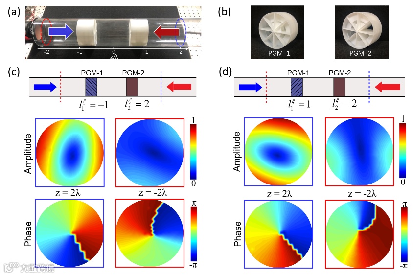 图4. 声学涡旋非对称产生的实验验证:(a)实验装置;(b)PGM样品;(c-d)实验结果:双层PGM的旋向相反(c)及相同(d)时,左/右入射下出射声场的幅值与相位分布。