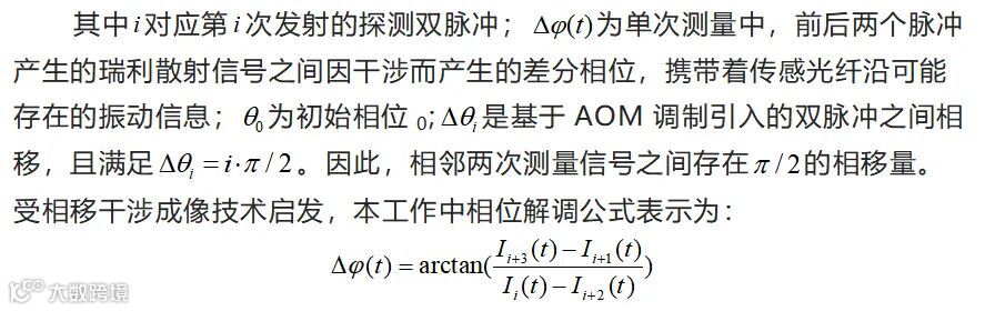 Φ-OTDR系统中,通过解调背向瑞利散射信号的相位信息,可以实现对振动事件波形的定量还原。目前主要的相位解调方法,包括引入本振光的外差/零差相干检测方法,以及不需要本振光的背向瑞利散射自相干检测方法。其中,前者由于本地振荡光的存在,信号强度大,且解调算法简单,但本振光和传感光纤远端返回的散射信号之间存在较大的时延,导致较严重的激光源相位噪声干扰,影响Φ-OTDR对低频振动的传感性能。而对于后者,主要实现方案有基于双脉冲探测的Φ-OTDR系统,以及在接收端结合非平衡干涉仪的瑞利散射自相干检测方案。在这两种方案中,干涉光之间的光程差是固定的(由双脉冲之间时间间隔,或非平衡干涉仪两臂之光程差决定),且远小于基于本振光的相干检测系统,因此可以将激光源噪声的影响大幅降低。但目前报道中,瑞利散射自相干信号的相位解调方法相对比较复杂,如phase-generated carrier, differential and cross multiply等方案。