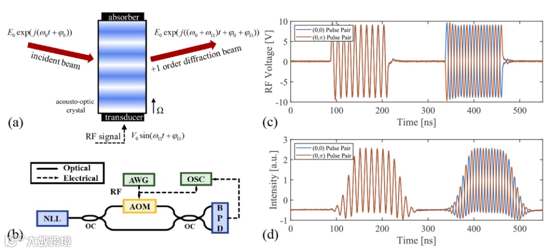 图1: (a)声光调制器工作原理。(b)验证方法可行性的光路。(c)两组射频双脉冲信号波形。(d)相应的两组激光双脉冲拍频信号波形