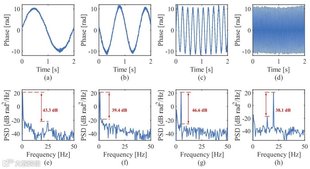 图3: 频率分别为(a) 0.5 Hz, (b) 1 Hz, (c) 5 Hz和(d) 20 Hz的外部振动的差分相位解调结果。(e)-(h)解调后的微分相位波形对应的功率谱密度(PSD)。