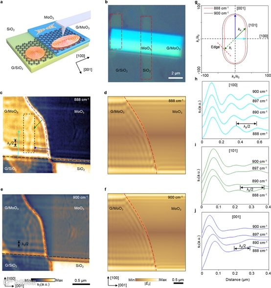 图2:石墨烯/α-MoO3异质结构的实空间成像。(a) s-SNOM实验方案示意图。(b)石墨烯/α-MoO3异质结构的光学图像。(c, e)实验近场振幅和(d, f)模拟电场分布。(g)石墨烯/α-MoO3中杂化极化激元的等频曲线。(h−j)在不同频率下沿图2c中青色、绿色和蓝色线测量的极化激元近场振幅分布。
