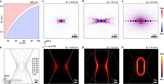 图3:石墨烯/α-MoO3异质结构中可调谐的杂化等离子体-声子极化激元。 (a) 异质结构中极化激元波前转变所需的石墨烯费米能级与α-MoO3厚度的关系。(b) 不同费米能级下石墨烯/α-MoO3异质结构中杂化极化激元的等频曲线。 (c−e) 石墨烯/α-MoO3异质结构中杂化极化激元的模拟电场分布和(f−h)相应的FFT图像。