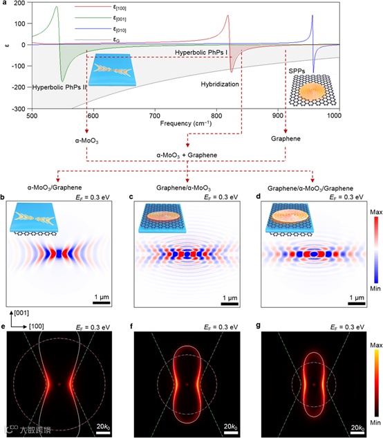 图1:不同α-MoO3和石墨烯异质结构中的杂化极化激元。(a) α-MoO3及石墨烯介电常数意味着两者重叠的工作波段。(b−d) α-MoO3/石墨烯、石墨烯/α-MoO3和石墨烯/α-MoO3/石墨烯异质结构中杂化极化激元的模拟电场分布,及其相应的色散分布(快速傅里叶变换(FFT)和解析等频曲线)。
