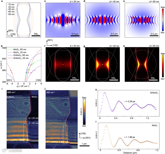 图4:石墨烯/α-MoO3异质结构中与厚度有关的杂化极化激元。 (a) 不同α-MoO3厚度的异质结构中杂化极化激元的等频曲线。(b)不同结构中PhPs和杂化极化激元的色散关系。(c−e) 石墨烯/α-MoO3异质结构模拟电场分布Re(Ez) 及(f - h)其相应的的FFT图像分布。在(i) 888 cm−1和(j) 900 cm−1下实验测量的场分布。(k,l)沿(j)中的紫色线和橙色线测得的极化激元线图。