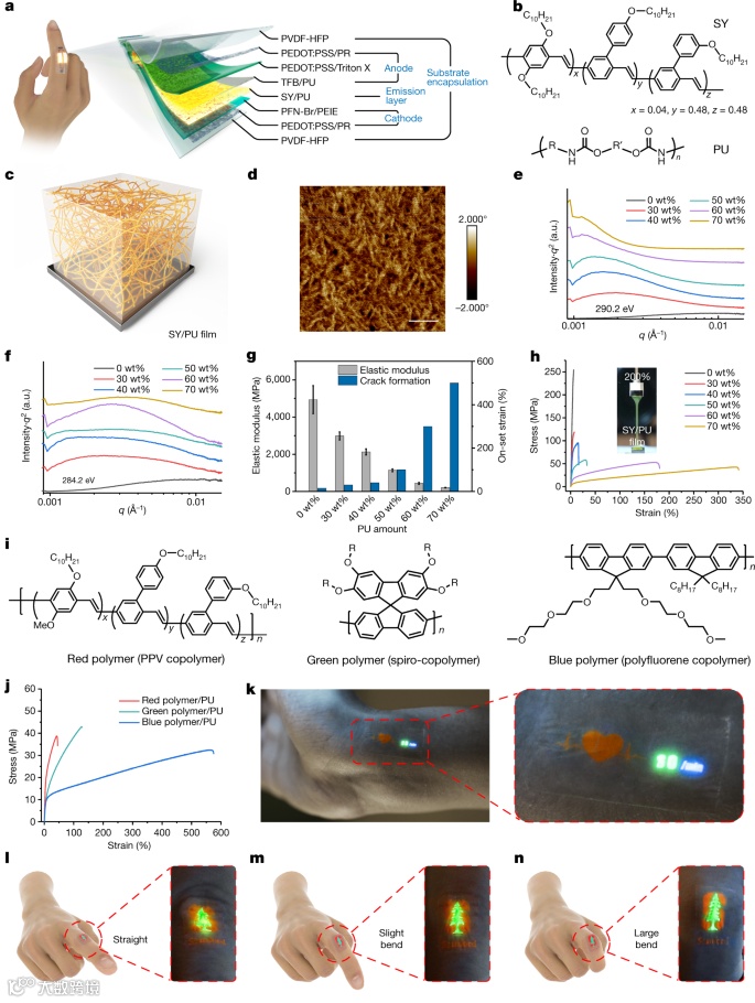 目前的可拉伸发光装置大部分是用无机材料制成的,要么需要高电压,要么可拉伸性、明亮度、分辨率都会在压力下受限。为解决这个问题,研究团队描述了可拉伸全聚合物发光二极管(APLED)的设计和制作流程。他们利用发光层与软弹性体自发相分离形成的纳米限制发光聚合物结构的策略,同时实现了增强的拉伸性和充电传输。此外,该可伸缩发光层与具有适当界面修饰的透明可伸缩高导电聚合物电极相结合,实现了亮度大约可达7,450 cd m-2、应变可伸缩约100% 的可伸缩APLED,总模量约为1 MPa (图1a)。具体而言,作者利用超黄(SY)作为发光聚合物和聚氨酯(PU)作为软弹性基体(图1b),与SY纳米纤维的均匀混合物在旋涂薄膜上均匀分布(纵向和横向)(图1c,d)。共振软x射线散射(R-SoXS)与掠入射x射线衍射(GIXD)结果表明SY薄膜具有较低的结晶度和面向取向,较短的π-π距离和较大的相干长度可以促进更好的电荷输运,这可能有利于共混物的亮度(图1e-f)。