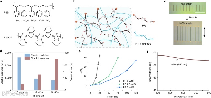 图 3. 高导电性和高度可拉伸的 PEDOT:PSS/PR 电极。
