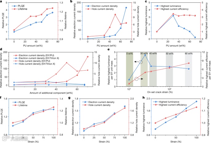较高数量的聚氨酯被观察到给予较高的光致发光量子效率(PLQE 值)(图2a),聚氨酯数量导致器件的性能变化启发作者:共混物可能受益于减少陷阱辅助的非辐射过程(图2b-c)。随着应变的增加,PLQE、电荷载流子输运密度(包括电子和空穴)、亮度和电流密度都增加(图2f-h),这是由于聚合物的取向和薄膜在应力作用下的垂直方向上的密度增加,这两者都有助于提高电荷和激子输运。