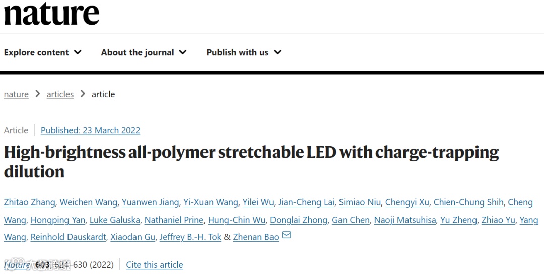 经过近四年的工作,今日该团队再次在高性能可拉伸显示器和电子皮肤领域取得重大突破:他们报告了一种材料设计策略和制造工艺,实现了具有高亮度(约 7,450 坎德拉每平方米)、电流效率(约 5.3 坎德拉每安培)和可拉伸(约 100% 应变)的全聚合物发光二极管。研究团队进一步制造了红色、绿色和蓝色的可拉伸全聚合物发光二极管,实现了皮肤上的无线供电和脉冲信号的实时显示。 这项工作标志着高性能可拉伸显示器取得了长足的进步。相关研究成果以题为“High-brightness all-polymer stretchable LED with charge-trapping dilutio”发表在最新一期《Nature》上,第一作者为张智涛。