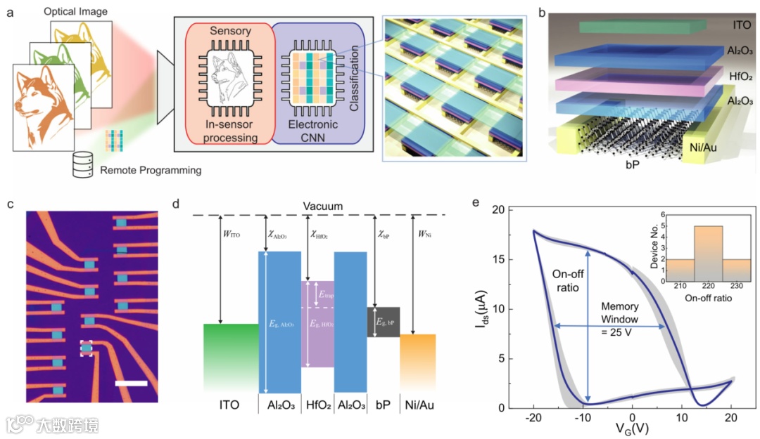 二维半导体在光电子学方面极具潜力,因为它们提供了具有可调谐光电特性的宽范围带隙。由于原子薄且可转移,它们易于与光子电路和微电子进行异构集成,以实现高级功能。在2D半导体中,黑磷(bP)因其可调谐的带隙而脱颖而出,其对应的红外光谱范围很宽。离散型、阵列型和波导集成型bP光电探测器已被证明具有令人信服的红外性能。利用其宽带红外响应,bP光电探测器阵列可用于多光谱成像,从而获取具有光谱信息的空间图像。多光谱成像结合人工神经网络(ANN)已成为生物医学成像、新鲜食品分类和工业现场表面损伤检测的强大工具。这种成像技术可产生大量数据,且计算密集、对延迟敏感,因此可以受益于新兴的边缘计算方案。在边缘而非云中对传感器内的图像进行预处理,可以大大减轻服务器的数据流负载,提高带宽预算,减少延迟和功耗。边缘计算的这些优势推动了光电边缘传感器的发展,该传感器将视觉感知和计算功能结合在同一设备中,最近已通过使用2D材料进行可见光/紫外光谱成像进行了证明。使用bP实现这种方案将把它扩展到红外光谱范围,实现智能夜视和多光谱传感。