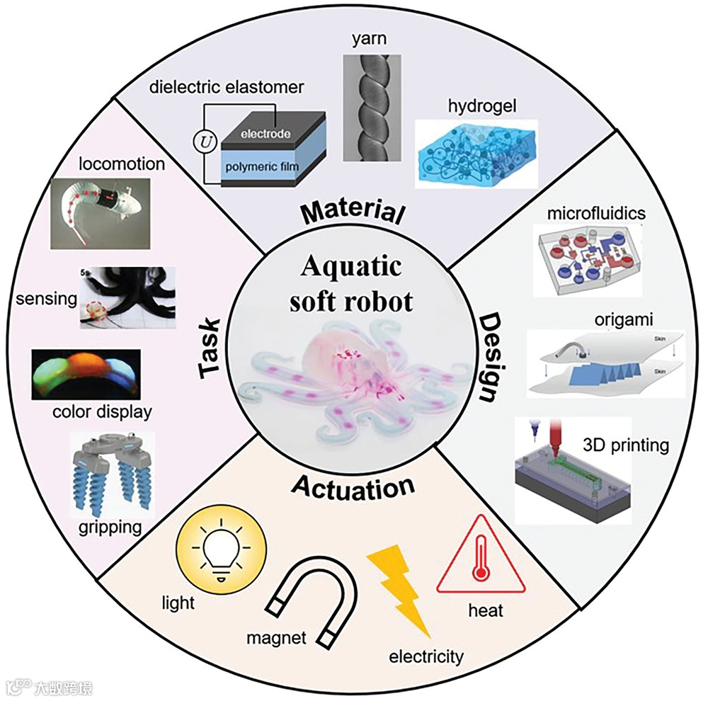 物联网和人机接口等新兴领域开创了软体机器人的前沿技术。软体机器人是由弹性体、凝胶和其他容易变形的物质制成的机器人。由于其柔软和柔顺,软体机器人可以充当人与机器之间的中介。当与软电子和人工智能相结合时,软体机器人和混合系统有望将人类与硬机器人和电子计算机连接起来,以执行任务和处理信息。在未来的神经控制接口、可穿戴计算和增强身体之前,软体机器人已经可以提供优于传统机器人的独特优势。传统的机器人通常是刚性的、笨重的并且在设计上非常复杂,它们可以发挥巨大的力量,并能高精度地完成复杂的任务。然而,它们只在固定的点周围弯曲和伸直,其不灵活性使得无法应对动态的、非结构化的或受限的环境。因此,在与适应性强的人类、动物和不可预测的情况打交道时,刚性机器人可能很危险。受无骨生物有机体的启发,软体机器人再现了软体生物的柔软、柔顺和响应性。它们可以伸展、扭曲和挤进狭窄的空间,可以在环境刺激下变形,也可以用柔软的触感抓住物体,在与人和动物互动时带来固有的安全性。软体机器人与传统的硬机器人有着根本不同的解决方案,是一种新型的机器。