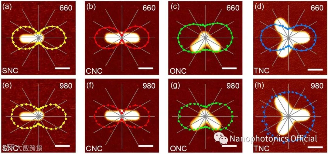 随后,研究人员研究了不同偏振角度激发下660 nm处上转换发光的激发偏振以及固定水平方向角度激发下660 nm上转换的发射偏振特性(见图3)。对于单个上转换纳米颗粒,由于小尺寸效应和表面效应破坏了基质对称的晶体场,使得它本身的上转换发光在角度空间上呈均匀分布,无明显偏振。然而,当纳米颗粒置于不同构型金纳米棒天线的“热点”位置后,其上转换发光呈现了线偏振特性。相比于ONC与TNC构型纳米天线,SNC与CNC构型金纳米棒天线得益于水平与垂直方向电磁近场增强强烈的反差而具有更明显的上转换发射和激发偏振特性,其中CNC构型金纳米棒天线获得了最高的85%和81%的发射和激发偏振对比度,与理论模拟结果符合良好。