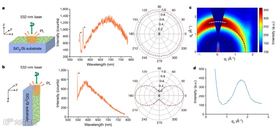 图3. 二维聚合物薄膜中的分子排列 (a-b)二维聚合物薄膜的荧光表征 (c-d) 掠入射广角X射线散射成像。
