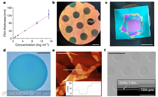 图2.二维纳米薄膜表征 (a) 旋涂溶液浓度与成膜厚度的线性关系 (b) 将二维薄膜转移到30 μm孔上 (c) 在SiO2/Si晶圆上的5层厚二维纳米膜 (d) 在6-inch (150 mm)上的7 nm二维聚合物膜 (e) 观测SiO2/Si晶圆上二维聚合物的破碎、褶皱、折叠 (f) 二维聚合物薄膜担载于Si3N4 TEM微栅的SEM图片。