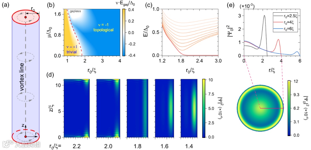 铁基超导纳米线中的Majorana涡旋态。(a) 铁基超导纳米线示意图;(b) 细纳米线中的拓扑相变;(c~d) 拓扑相变附近最低能态的能谱和波函数变化;(e) 细纳米线中分布于边缘的Majorana涡旋态