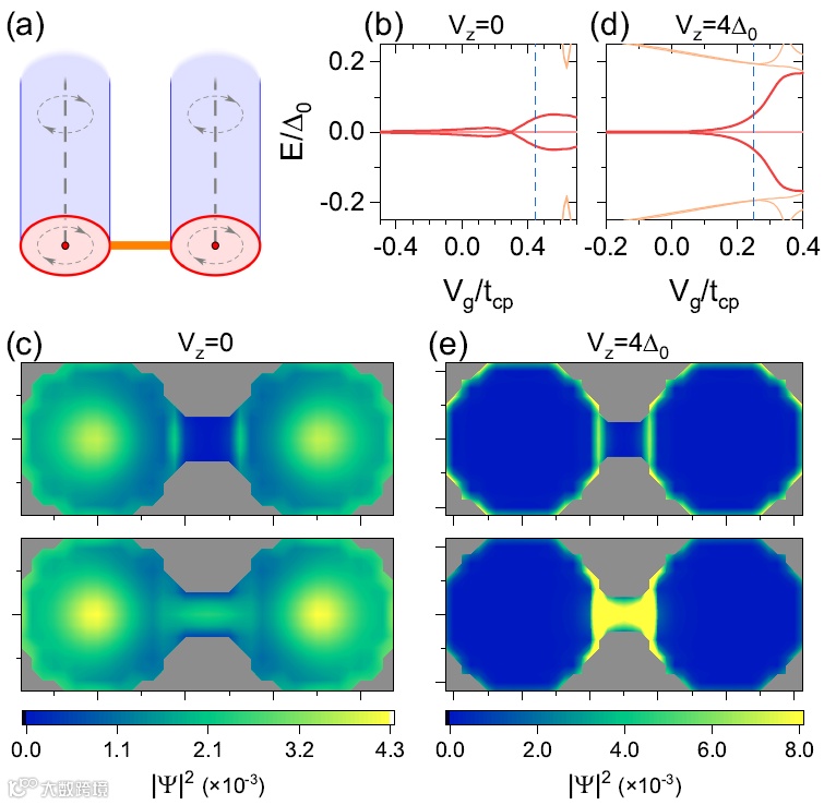 Majorana零模的耦合。(a) 两纳米线连接示意图;(b~c) 控制Majorana涡旋态耦合前后的能谱和波函数变化;(d~e) 控制Zeeman场诱导的Majorana边缘态耦合前后的能谱和波函数变化