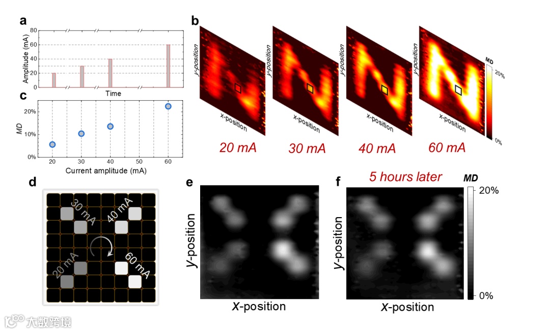 图3 施加不同强度的电流脉冲实现多灰阶图像的写入和5小时后的保存图像。