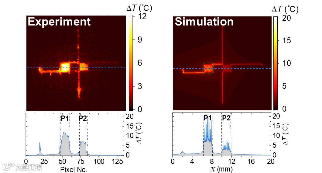 图2 像元间热串扰的测试和仿真结果。