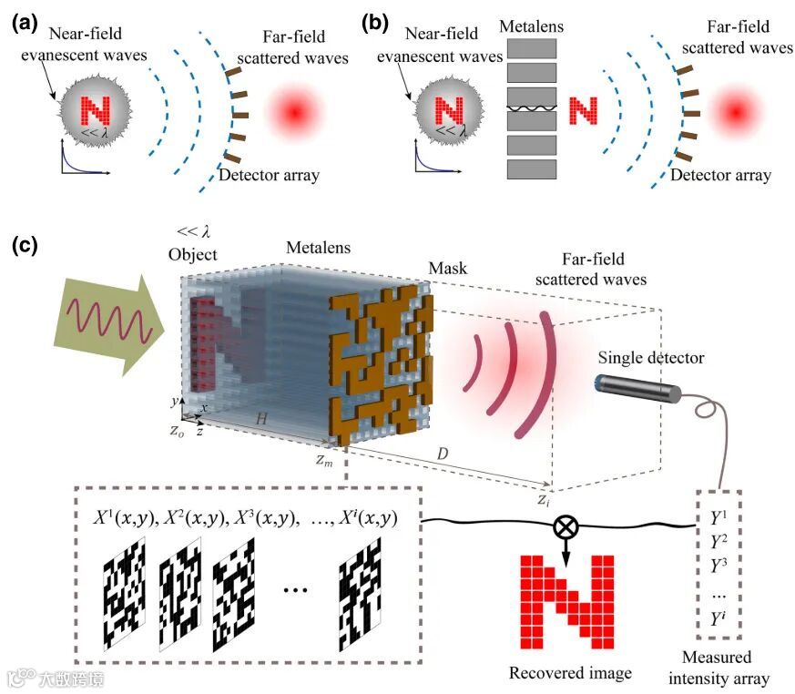 图1 (a)入射声波经过亚波长物体之后,倏逝场携带了物体的亚波长特征,其随着传播距离的增加呈指数衰减,进而导致远场处亚波长信息的丢失;(b)孔洞结构型超透镜,其作用在物体的近场区域,能够实现倏逝波至行波的耦合传输。但是,倏逝场离开结构表面后,其将再次指数衰减,无法传播至更远的探测区域;(c)声学超分辨计算成像系统示意图