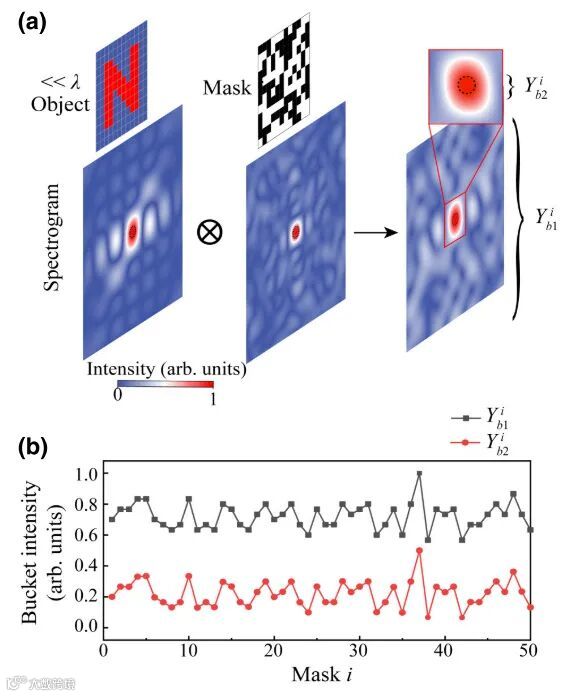图1(c)为本工作的超分辨计算成像系统,该系统基于鬼成像“结构化”采样的思路,在声学超透镜成像架构的基础之上,添加了一组掩膜板,用于成像目标的结构化探测。由于物体和掩模版的空间频率卷积作用,物体的倏逝波分量可以影响透射场整体的行波分量,进而这部分信息可以传递至远场。通过时序上改变掩模版的图案,并依次记录下探测的强度信息。基于计算鬼成像的图像重构算法,通过关联掩模版的空间图案以及对应的透射场的强度,即可恢复出物体的图像。