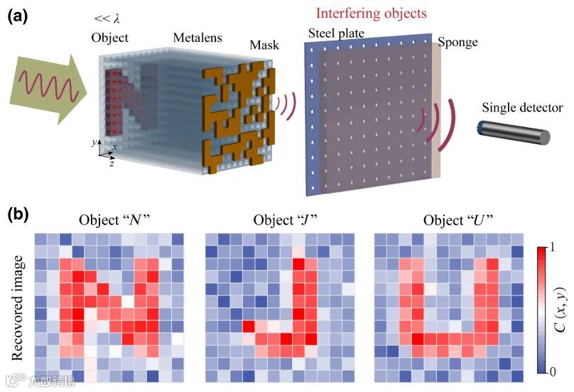 声学成像在很多领域都有广泛的应用,例如生物医学成像、无损检测、水下声纳系统等。然而,传统声学成像的分辨率受到衍射极限的限制,其无法在远场下清晰地分辨成像物体的亚波长特征。如何突破衍射极限实现亚波长成像,是成像领域的热点问题。另外,传统声学成像往往依赖于点对点的探测方式,这种方式的电路复杂,成本昂贵,并且对环境的干扰因素异常敏感。