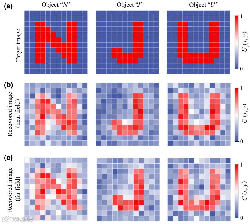 为了验证该成像系统,本工作了开展声学超分辨鬼成像的实验和数值仿真工作。声学超透镜和掩模版图案的相关设计,如图3、图4所示。实验上,传感器分别置于超透镜的近场和远场区域。通过测量一组掩模版对应的透射场强度后(测量次数N = 256),基于二阶关联算法,恢复出“N”、“J”、“U”物体的图像,如图5所示。可以看出,两种探测距离下,成像结果都较好,可以分辨出物体的亚波长细节特征,图像的分辨率约为λ/57。