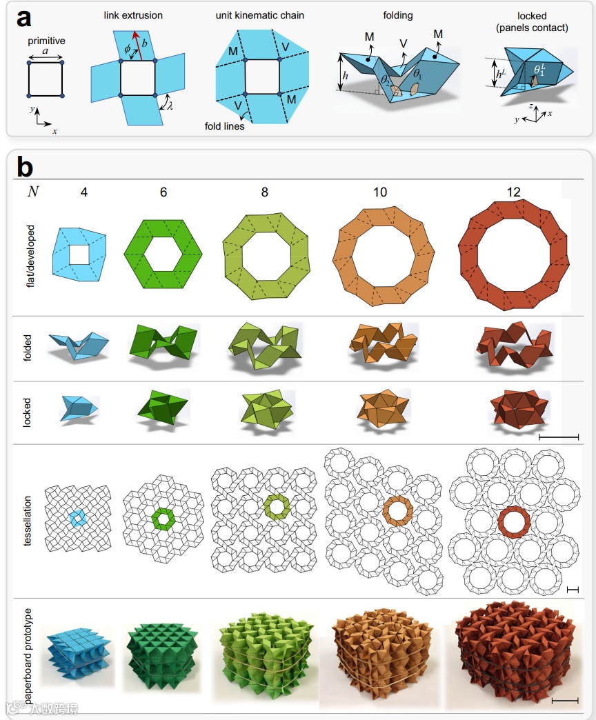 近日,加拿大麦吉尔大学机械工程系的Damiano Pasini研究团队融合了折纸和剪纸的概念,引入了一类拓扑结构的刚性可平折超材料,这些超材料可在原位重新编程,并沿多个反向重新设计,使得该结构部分可平折,部分是锁定的,并且后者在多个方向也可维持刚性态。他们设计的这种折痕图案,在平面中呈现蜂窝状,随后利用最少的堆叠层数,引导结构依照折痕进行折叠。此外,为了赋予其可重构性,在该超材料的折痕图案中引入了剪纸思维,由于结构单元间的面部接触,该超材料可以重新调整为其他几个平面可折叠且空间可锁定的折叠路径。这种设计思想具有拓扑结构和对称变换特征,极大地增强了原位可编程特性。该团队还提出了一个简单而有效的制造过程,可以很容易地实现自动化,使平面结构具有三维性,具有一定的实用意义。相关研究发表在《Nature Communications》上。(钟雨豪)