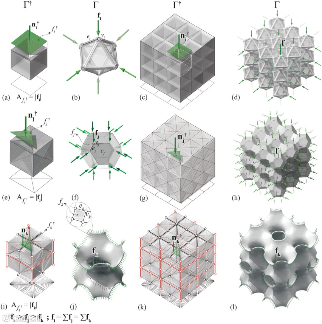 近日,加拿大麦吉尔大学Abdolhamid Akbarzadeh和美国宾夕法尼亚大学Masoud Akbarzadeh团队介绍了一种基于静力平衡、多面体框架平衡和形式和力互易性的替代设计策略。这种新方法揭示了桁架系统结构、拓扑对偶和基于3D图形静力学的力平衡之间的几何关系。该技术适用于在某些边界条件下设计周期性的基于杆件的蜂窝结构,并对其进行操作以构建具有各种力学性能的基于壳的蜂窝。通过将物化单元视为代表性体积单元(RVE),采用多尺度均匀化方法研究其有效线弹性特性。通过3D打印索状材料的实验测试验证,结果表明,通过使用所提出的方法、替代杆件物化方案和合理添加支撑杆件来操纵RVE拓扑,可以系统地构建蜂窝力学超构材料,以展示从弯曲到拉伸的特性,实现超流体行为,或创建新型混合外壳。相关研究发表在《Advanced Functional Materials》上。(徐锐)